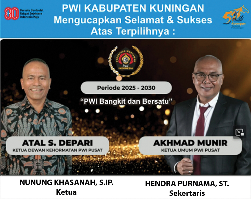 Ketua PWI Kabupaten Kuningan Nunung Khasanah, S.IP, dan Sekretaris, Hendra ST, mengucapkan Selamat dan Sukses atas Terpilihnya Akhmad Munir sebagai ketua Umum PWI Pusat, dan Atal S. Behari sebagai ketua Dewan Kehormatan PWI Periode 2025 – 2030, (Tan)