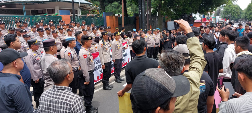 Dalam aksinya mereka merangsek berupaya masuk ke Halaman Kantor BTNGC namun dijaga ketat puluhan anggota Polres dan sejumlah Polwan dipimpin Kapolres Kuningan, AKBP Muhamad Ali Akbar.