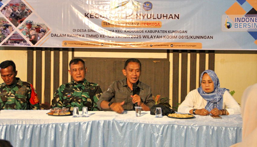 Kuningan, MI.com — Badan Narkotika Nasional Kabupaten (BNNK) Kuningan bersama Kodim 0615/Kuningan menggelar sosialisasi preventif bahaya narkoba di Gedung Serbaguna Desa Sindanggjawa, Kecamatan Kadugede, Rabu 8 Agustus 2025.