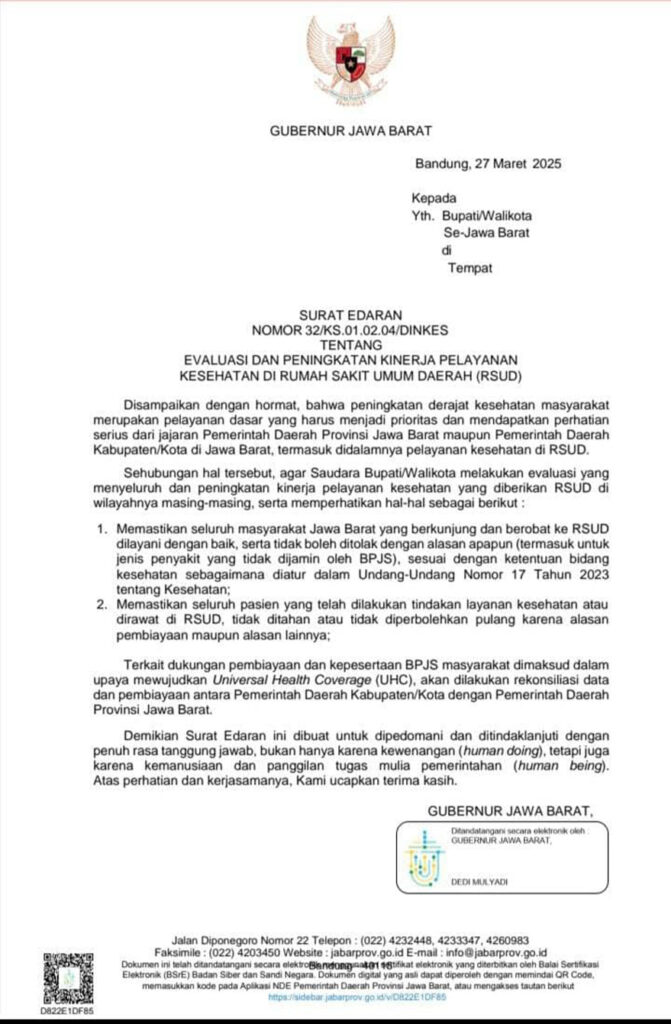 BANDUNG, MI.com — Gubernur Jawa Barat, Dedi Mulyadi, mengeluarkan Surat Edaran Nomor: 32/KS.01.02.04/Dinkes tentang Evaluasi dan Peningkatan Kinerja Pelayanan Kesehatan di Rumah Sakit Umum Daerah (RSUD).