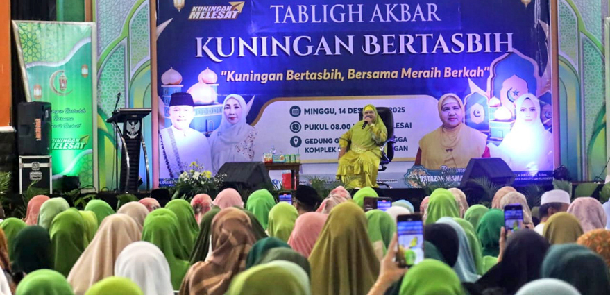 Kuningan, MI.com — Ustadzah Mamah Dedeh menyapa ribuan jamaah di GOR Ewangga Kuningan pada Tabligh Akbar bertajuk “Kuningan Bertasbih, Bersama Meraih Berkah” yang digelar Lembaga Koordinasi Kesejahteraan Sosial (LKKS) Kabupaten Kuningan, Minggu (14/12/2025).