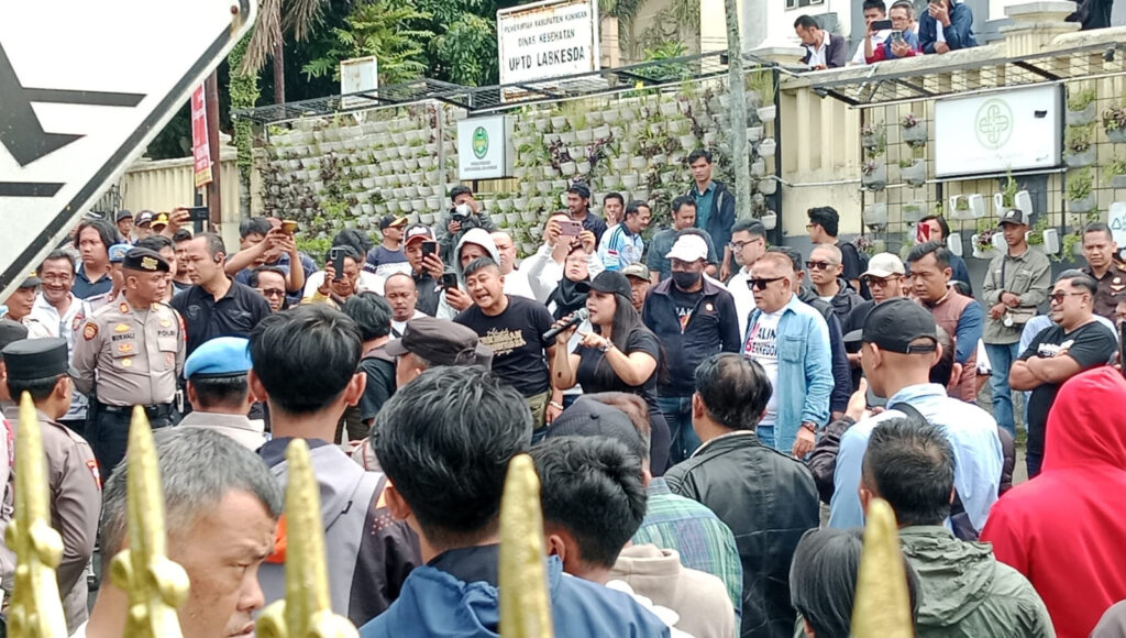 Hal itu ditegaskan Ketua LSM Frontal Uha Juhana, di hadapan Kepala Kejaksaan Negeri (Kajari) Kuningan, Yustina Engelin Kalangit, S.H.,M.Hum; dan Kasie Intelijen Kejari, Brian Kukuh Mediarto,S.H. Aksi unjuk rasa yang diikuti puluhan massa aksi, di depan pintu gerbang kantor Kejari Jl. Aruji Kertawinata Kuningan, Rabu (01/04/2026) pukul 10.30 – 12.00 WIB.
