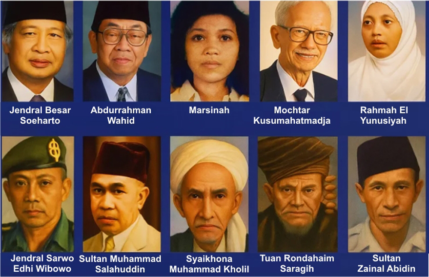 1. Almarhum K.H. Abdurrahman Wahid dari Provinsi Jawa Timur (Pahlawan dengan perjuangan politik dan pendidikan Islam). KH Abdurrahman Wahid atau Gus Dur adalah tokoh bangsa yang sepanjang hidupnya mengabdikan diri memperjuangkan kemanusiaan, demokrasi, dan pluralisme di Indonesia.