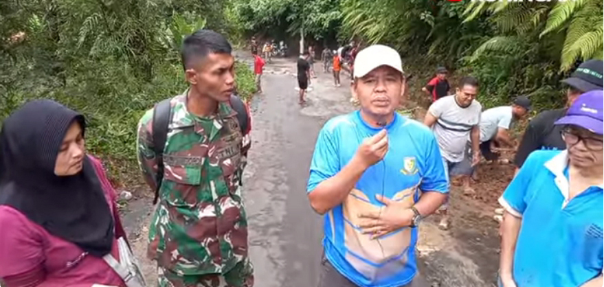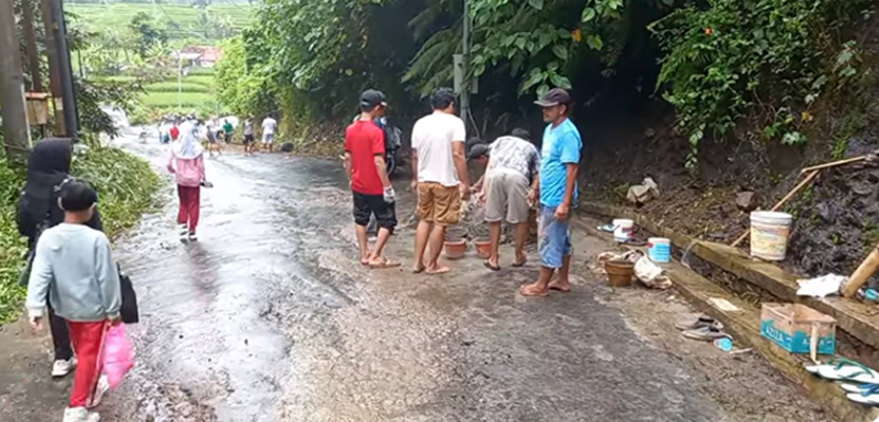 Warga Perum Graha Alana, tukang ojek, dan warga Cibinuang kompak kerja bakti ditanjakan Liang Panas, Kelurahan/Kecamatan Kuningan, Minggu (18/1/2026) (photo: tangkapan layar vidio kabarkuningan)