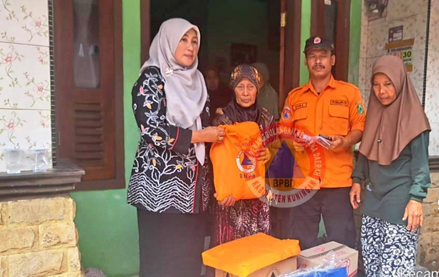 Wabup Kuningan, Tuti Andriani menyerahka bantuan logistik ke korban kebakaran Eem Nengsih (76) di Desa Sangkanurip, Kecamatan Cigandamekar, Jumat (5/9/2025)
