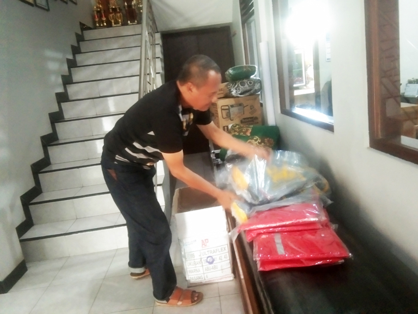 Kepala Desa Kedungarum, Kecamatan Kuningan, Sarip Hidayat memperlihatkan bantuan perlengkapan untuk Angota Satuan Linmas dan pakaian Petugas Kebersihan di ruang kerjanya, pekan lalu.
