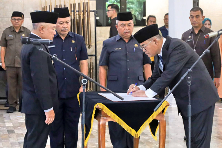 Bupati Kuningan, Dian Rachmat Yanuar melantik Uu Kusmana menjadi Sekda Kuningan di Teras Pendopo Kuningan, Kamis (6/11/2025)